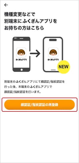 ④「機種変更などで別端末にふくぎんアプリをお持ちの方はこちら」の「顔認証/指紋認証の再登録」をタップします。