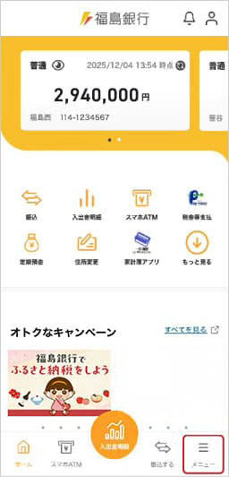 ①画面右下の「メニュー」をタップ。