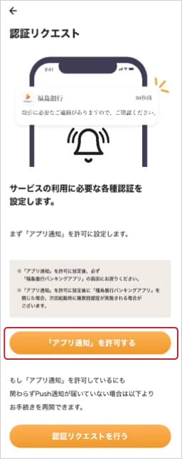 ③「アプリ通知を許可する」をタップ。通知を許可に設定後、ふくぎんアプリ画面に戻る。