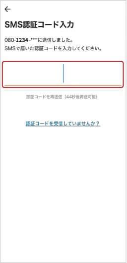 ⑥登録の携帯電話番号に届いたSMS認証コードを入力します。SMSが届かない場合はこちらをご確認ください。