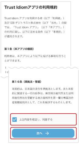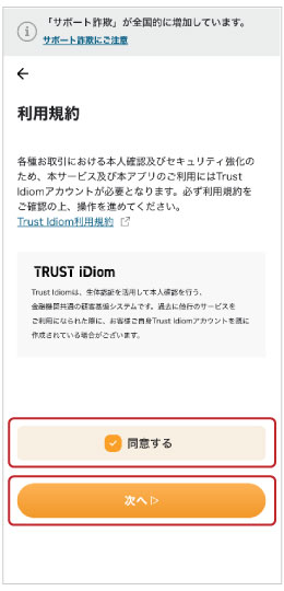 ②Trust Idiom利用規約を確認し「同意する」にチェックします。