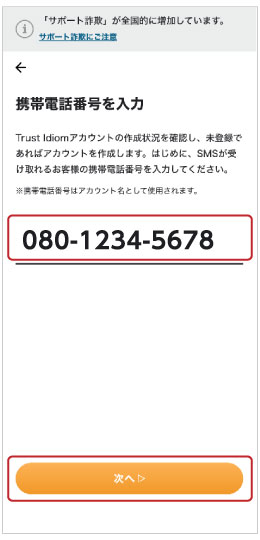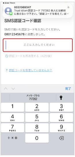 ⑩登録の携帯電話番号に届いたSMS認証コードを入力します。SMSが届かない場合はこちらをご確認ください。
